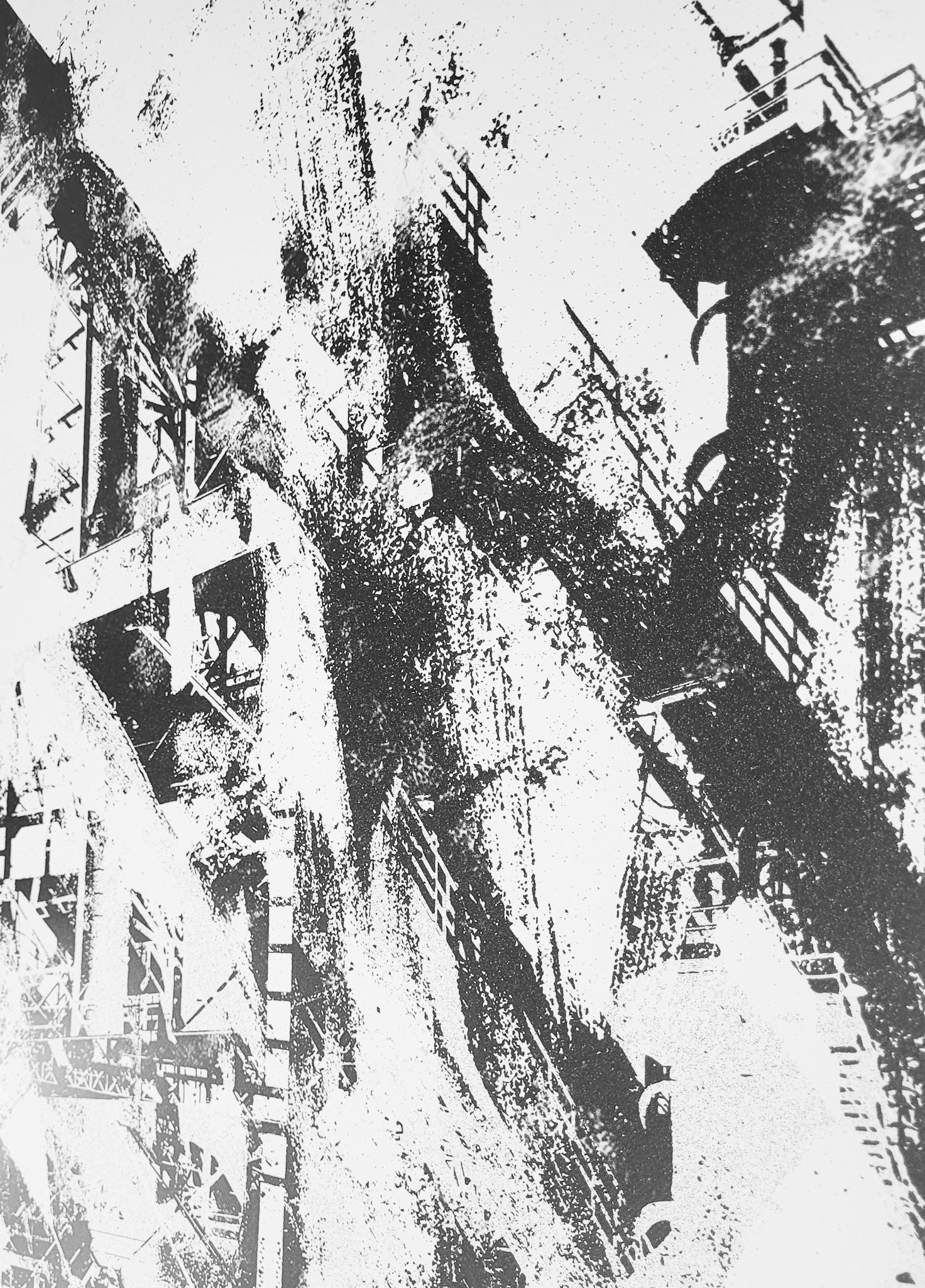 By combining analog techniques (acrylic, India ink, photography) with digital processing, he creates powerful compositions in which architectural rigor meets the spontaneity of gesture.
